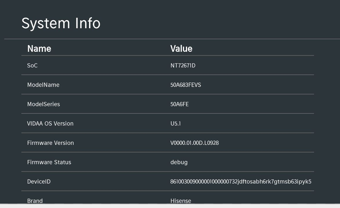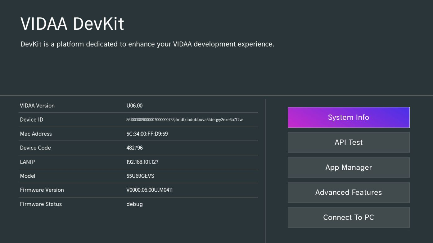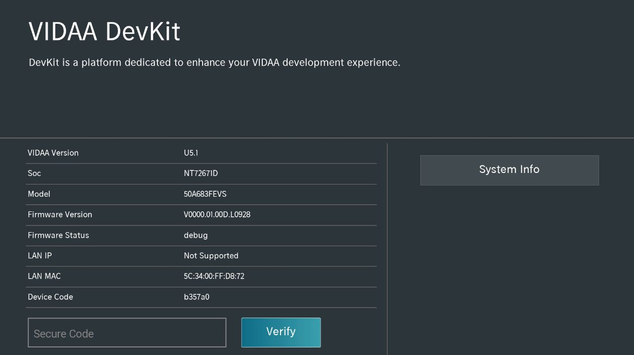 - Your VIDAA TV is manufactured or upgraded in 2021 or later (Firmware version > L0901), or verify compatibility using the platform support table below by checking the SoC and VIDAA OS Version shown in DevKit > System Info: