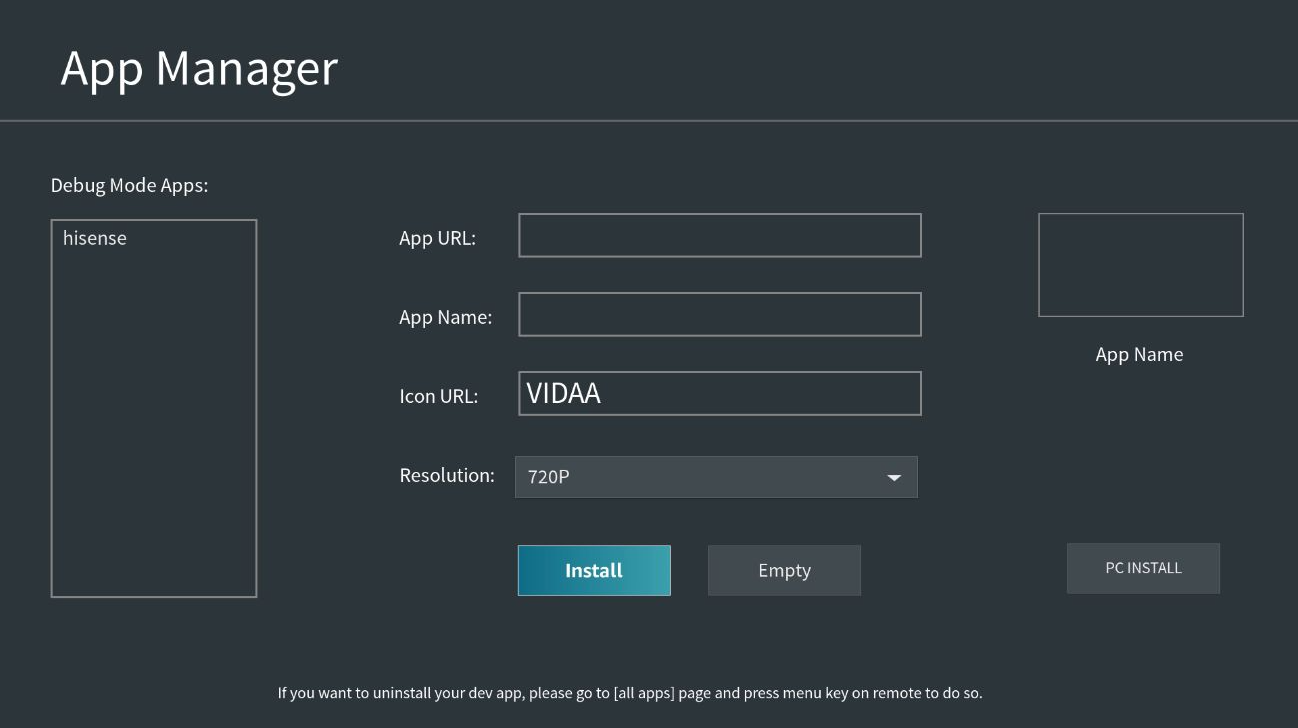 DevKit is an application designed for developing and debugging web applications, and for installing third-party applications on TVs running VIDAA OS. DevKit is not installed by default and must be enabled following these steps: