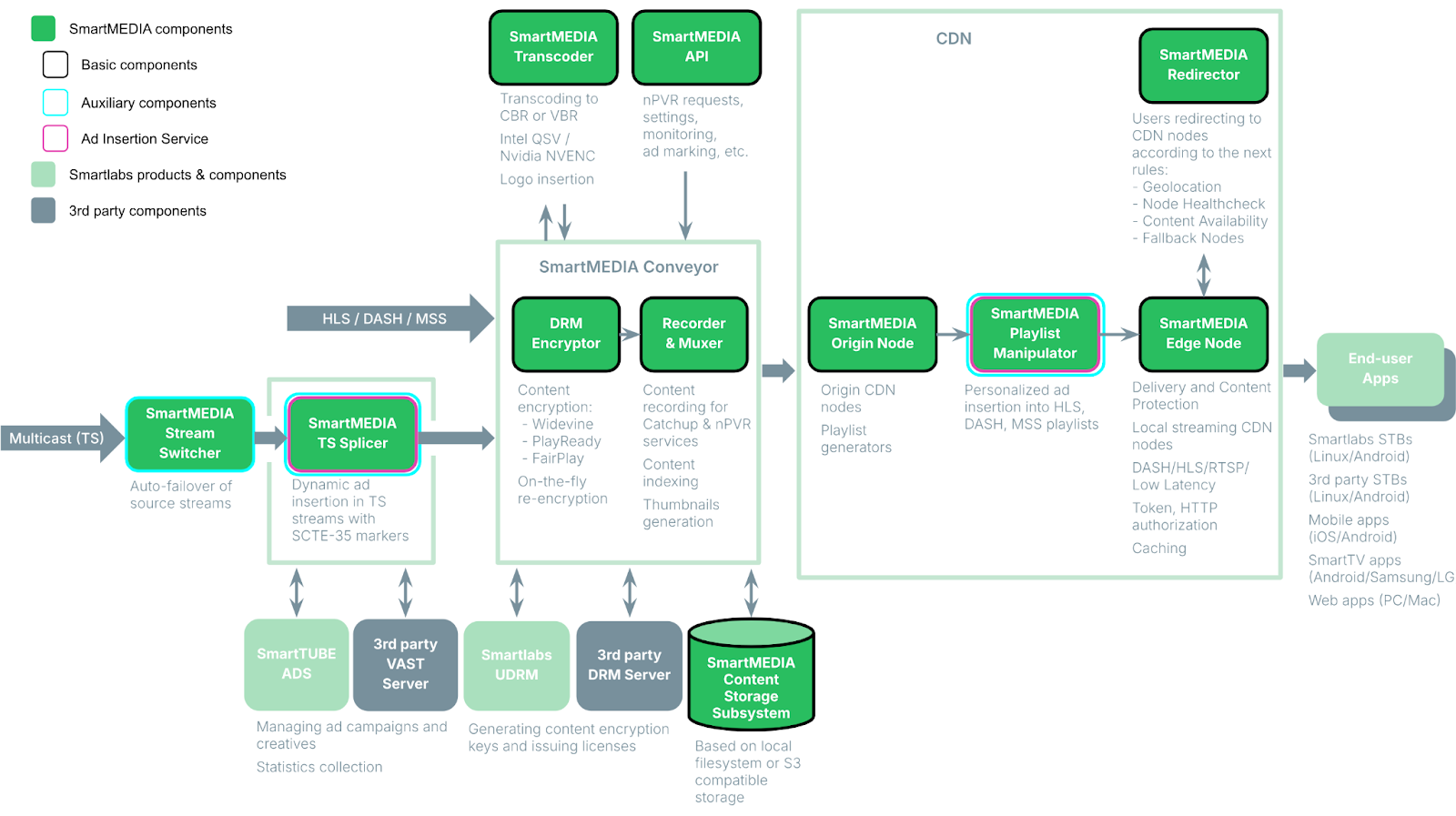 SmartMEDIA supports a variety of streaming protocols (MPEG-DASH, HLS, RTSP), video resolutions (from SD to UHD) and codecs (H.262/MPEG-2, H.264/AVC, H.265/HEVC, various audio codecs, etc.), allows you to deliver media content to a wide range of subscriber devices and players, including set-top boxes, browsers, Smart TVs, Apple iOS devices, Android devices, etc.