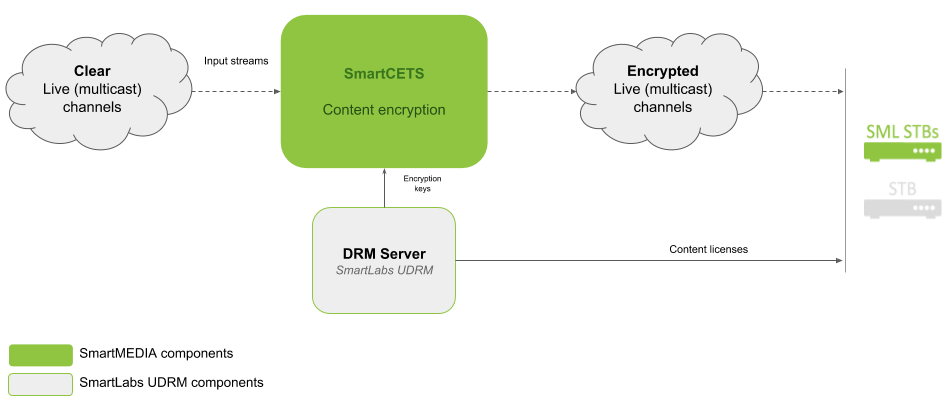 After receiving the list of input multicast streams, SmartCETS/cets requests keys for encryption from the key server over the SmartLabs UDRM protocol. Encrypted content is either written to a file or broadcast to another multicast group using the UDP protocol. For the SmartCETS service, the list of input streams for encryption along with other parameters must be specified in the configuration file. For the cets utility, all parameters must be passed as command-line arguments.